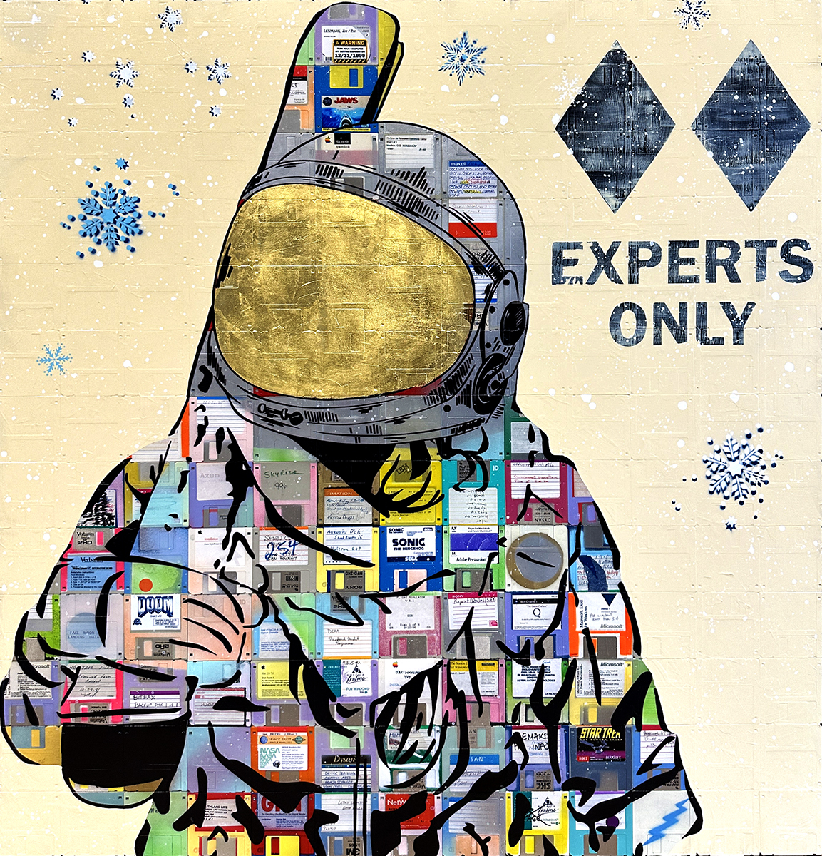 Smith’s work turns salvaged, unrecyclable floppy diskettes into paintings that explore the visual lexicon of popular culture, time and nostalgia. Drawing from pop art’s historical use of reappropriated images, these paintings recontextualize our understanding of obsolete technology and the anonymous information they contain, bringing the past into the present moment to ask important questions about our digital identities and the materiality of contemporary painting.