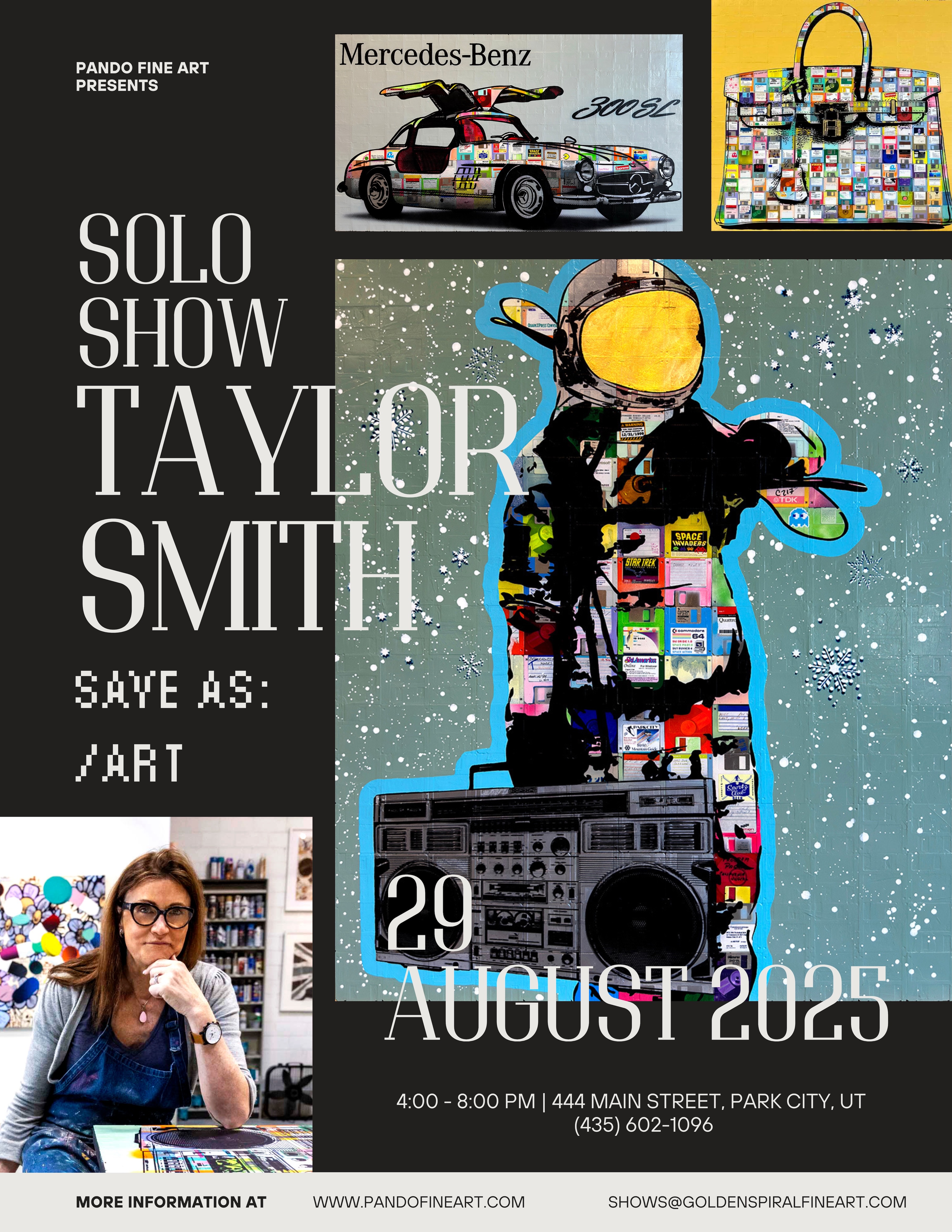 Park City, UT – Multimedia artist Taylor Smith debuts new works from her ongoing floppy diskette paintings series in the exhibition Save As:/ Art with Park City Fine Art Gallery, on view August 29th – September 30th at Pando Fine Art 444 Main Street, Park City, UT, 84060. There will be an opening reception Friday August 29th 4pm-8pm with the artist.